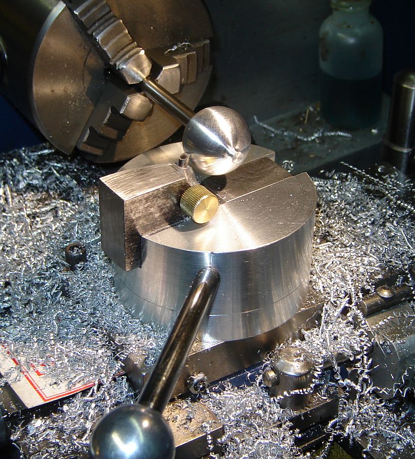 It's a nice project for the ball cutter but the top's dimensions affect its operation. This one works well; other dimensions may work better - or not at all. The diameter of the ball is 1.24". The 1.25" round is cut to 1.3" length and the 0.77" deep hole is drilled to 1/2" then bored to 0.58"; the bottom of the hole was flattened with a 1/2" end mill (optional). The hole was drilled through with a #3 and tapped 1/4-28. The end of a 0.312 round was turned down to 0.25" for about 0.6" and threaded 1/4-28. This shaft is threaded into the hole in the stock to hold it while turning the ball. The part of the shaft that extends below the ball is rounded in the process of making the ball, of course. The shaft will be difficult to impossible to remove after making the ball, depending on how hot the ball gets while cutting. Part the shaft so the stem protrudes about 0.31".