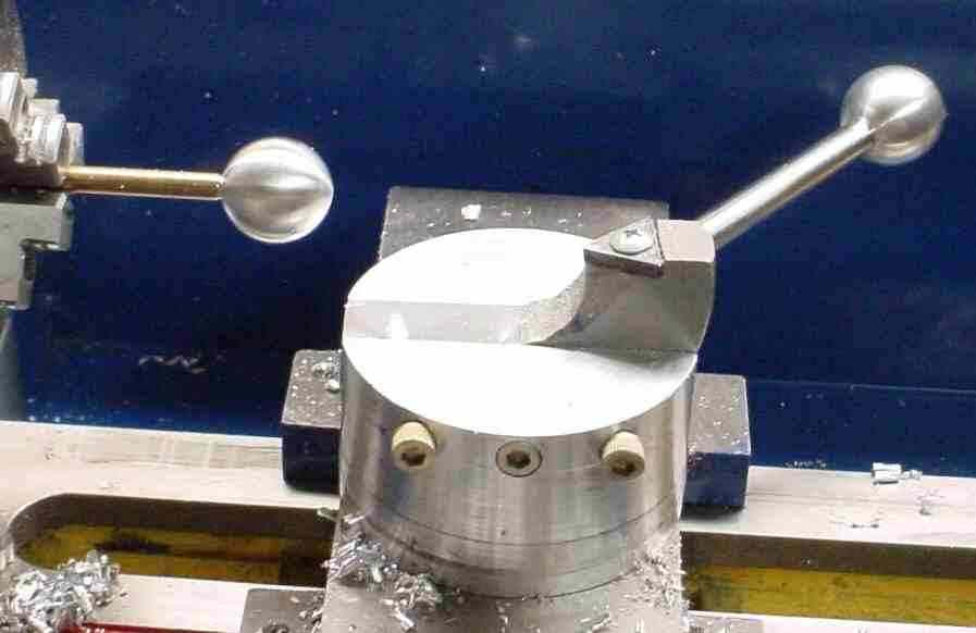 In use the attachment replaces the compound slide and is secured to the cross slide via two socket head screws accessed through the toolholder slot as shown in this picture. The cutter must be on the centerline so once I found this position of the cross slide I scribed a witness mark on the carriage to simplify subsequent use. The steel for the tool holder was part of a trailer hitch in its prior life and the ball on the handle was made using the ball fixture, of course.