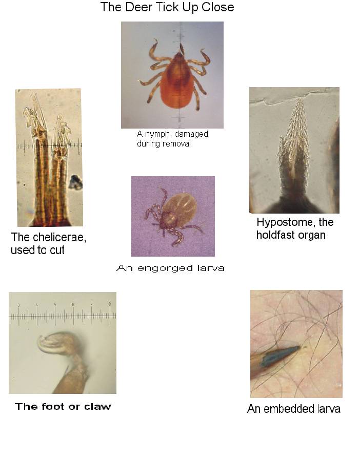 A deer tick acquires the Lyme disease bacteria when it feeds on the blood of a small animal (usually a mouse) which has Lyme disease. Once infected, the deer tick retains the Lyme disease bacteria through subsequent molts. The dog tick (aka wood tick) can also get Lyme disease but the disease is not retained through the subsequent molt so dog tick bites do not generally cause Lyme disease. (Dog tick larvae and nymphs are very similar to deer tick larvae and nymphs, it takes a sharp eye to tell them apart; the palps and hypostome are the most obvious differences).