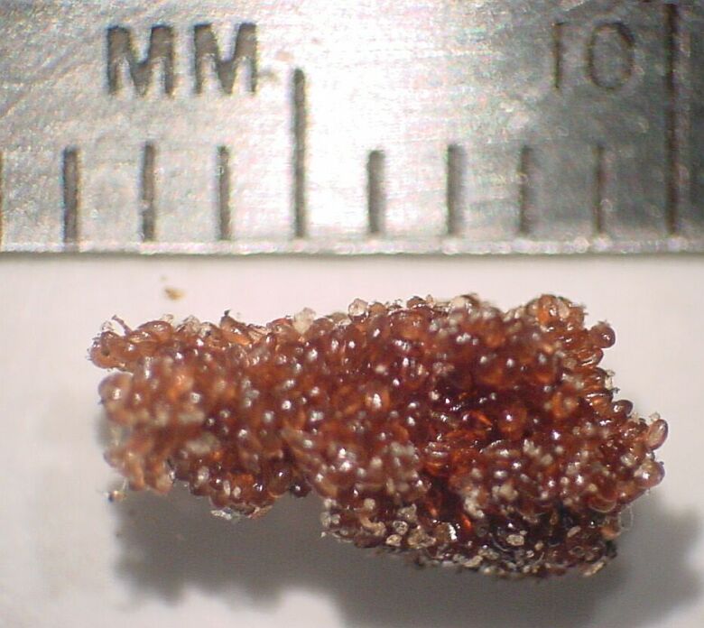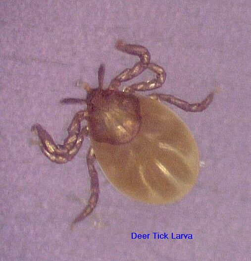 Deer tick eggs hatch in the spring or summer beginning in April. The larvae from these eggs are very small, about 0.7mm or 0.025 inch long. The larva, like all stages of the deer tick, are blind and parasitic: they feed on the blood of mammals, reptiles and birds. The larva (which has 6 legs) "quests" for its blood meal by climbing up a stalk of grass or brush, then awaits the passage nearby of a host animal; any animal which brushes against the larva's perch becomes a host. A deer tick larva can wait for its meal for up to about 5 months before it dies from starvation or dehydration. About 10% of larvae find a host, feed and drop off to molt. If the host was infected with Lyme disease, the tick becomes a carrier. The most common host for deer tick larvae in CT is a mouse but other larger hosts, though less common, are possible including all small animals: chipmunks, squirrels, rabbits, birds, dogs, cats, deer and humans.