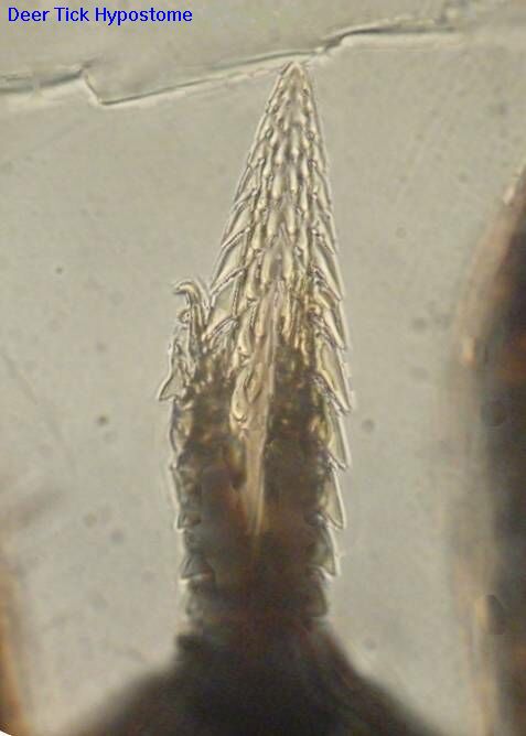 The hypostome is the holdfast organ which anchors the tick to the wound while it feeds. In this picture the chelicerae are visible partially extended over the hypostome. The chelicerae may be extended beyond the end of the hypostome.