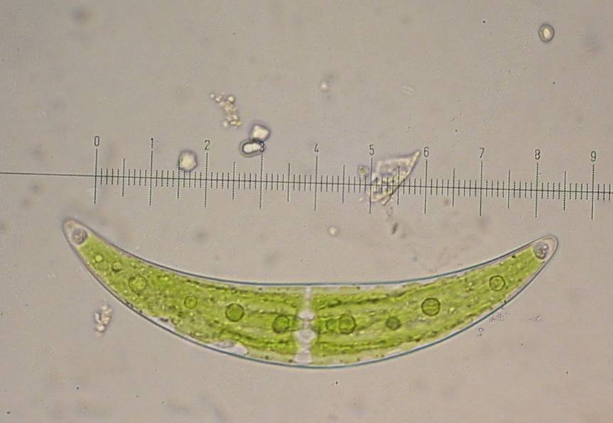 Closterium has little crystals of gypsum near each end which move, looking like passengers peering through a viewport in a submarine.