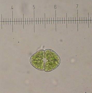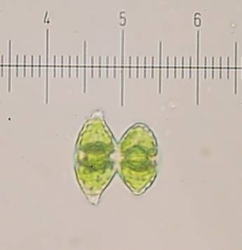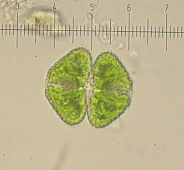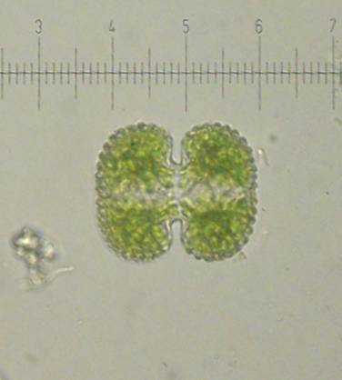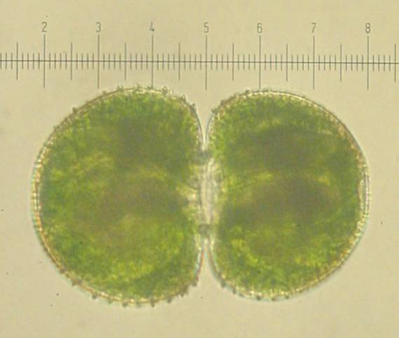 Cosmarium has many different species. The semi-cells here are different sizes because it has recently reproduced.