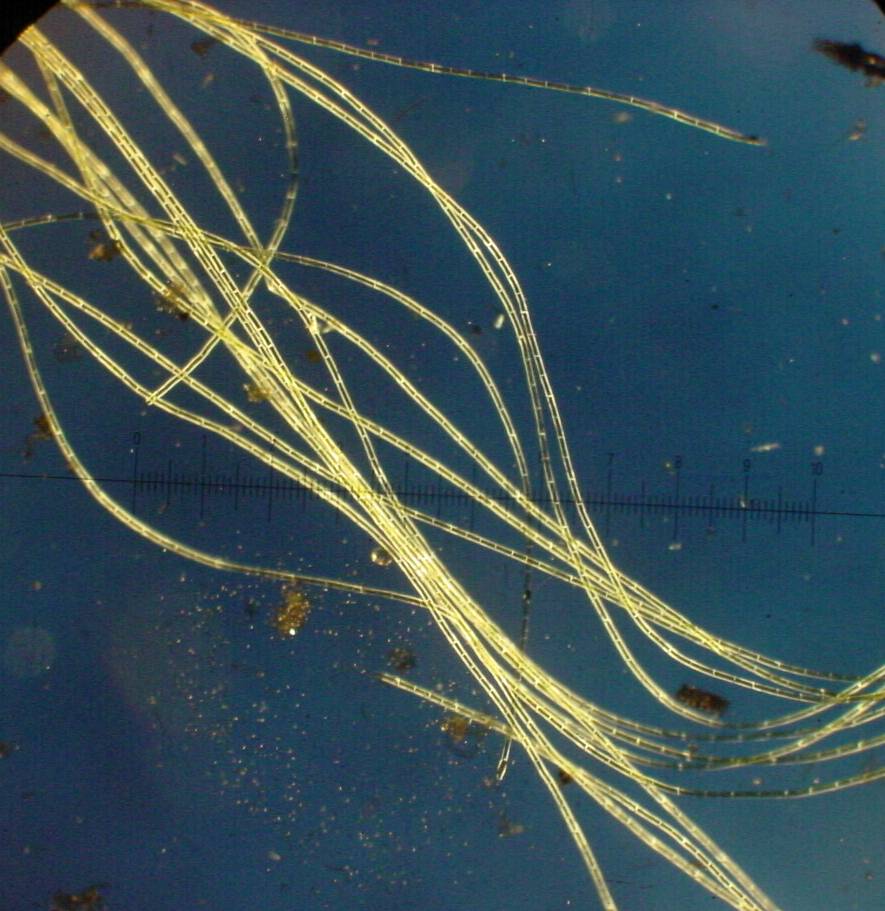 Filamentary type algae, in polarized light. These look like a freeway at night. Some of the protists moving about nearby produce flashes like tiny emergency vehicles due to this polarized light.