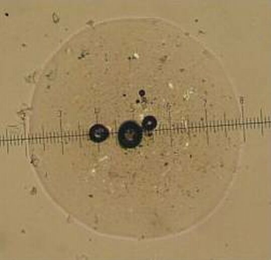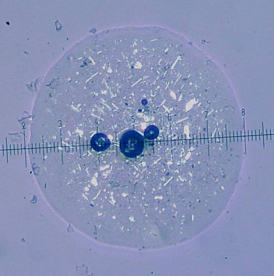 Same blob in polarized light. Many of these appeared in late summer, they don't move. No clue what they are or whether they're alive.