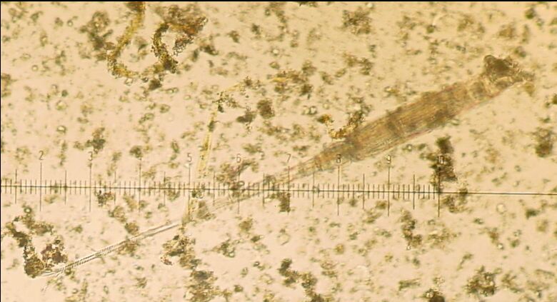 A bdelloid, hanging by its tail from some algae