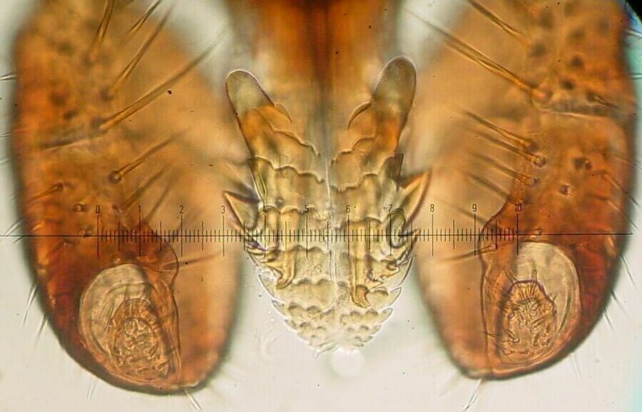 After laying eggs the tick dies, note the shriveled appearance (bottom view).