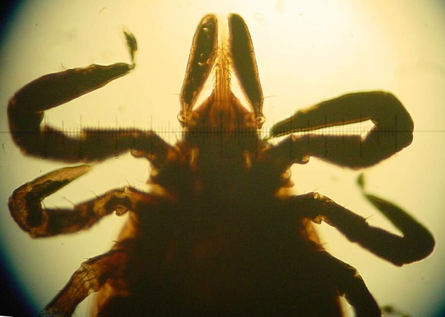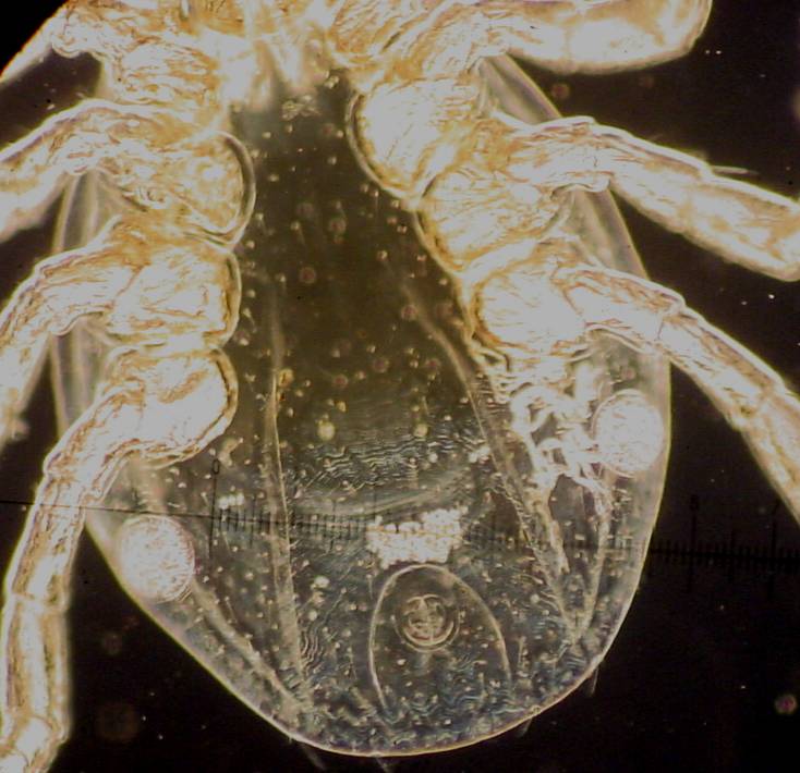 Deer Tick Nymph, bottom view live, Adults have a genital pore mid-way between rearmost legs