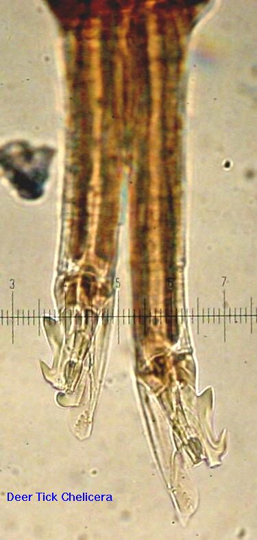 These tick pictures are an adjunct to the paper Dealing with Deer Ticks provided on this site. Most people are not familiar with deer ticks and cannot tell a deer tick from a dog tick -- the goal here is to help in identification as well as to provide information on how to tell when a tick may be carrying Lyme disease and when it is very unlikely. All you need is a 10 power magnifier to determine whether a deer tick is a larva (6 legs, unlikely to carry Lyme) or a nymph or adult (8 legs, commonly infected with Lyme and/or other tick borne illnesses here in CT) -- read the paper on this site for more info. The numbered scale shown in most of the pictures can be used to judge the exact size but you must be somewhat familiar with the tick type to determine which objective was used to take the picture -- 250/100/25 microns per numbered division (1000 microns=1mm) are produced by the 4/10/40 power objectives respectively. The tick pictures here are available by clicking on the descriptions, this to minimize bandwidth for those who arrive here by accident.