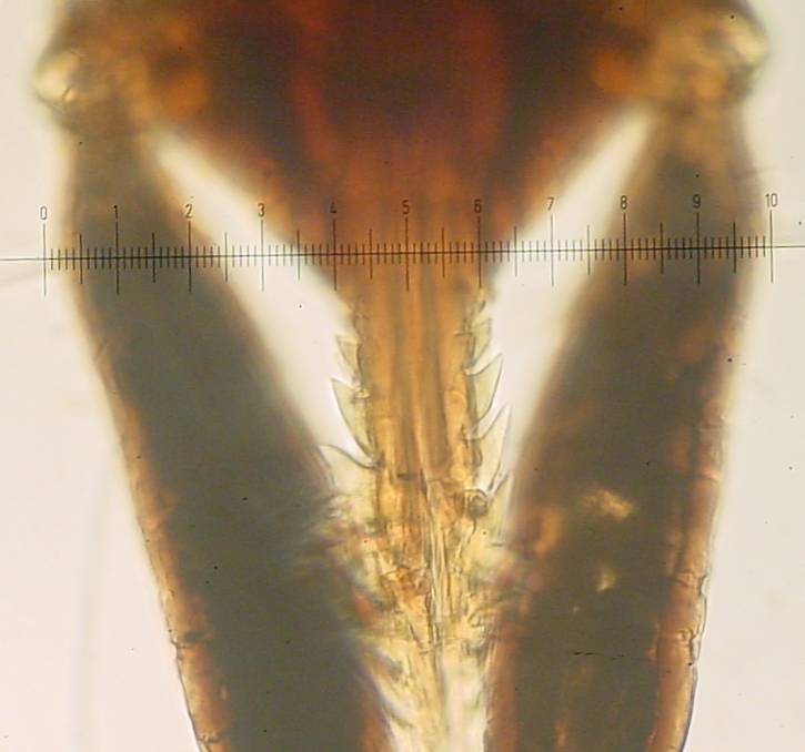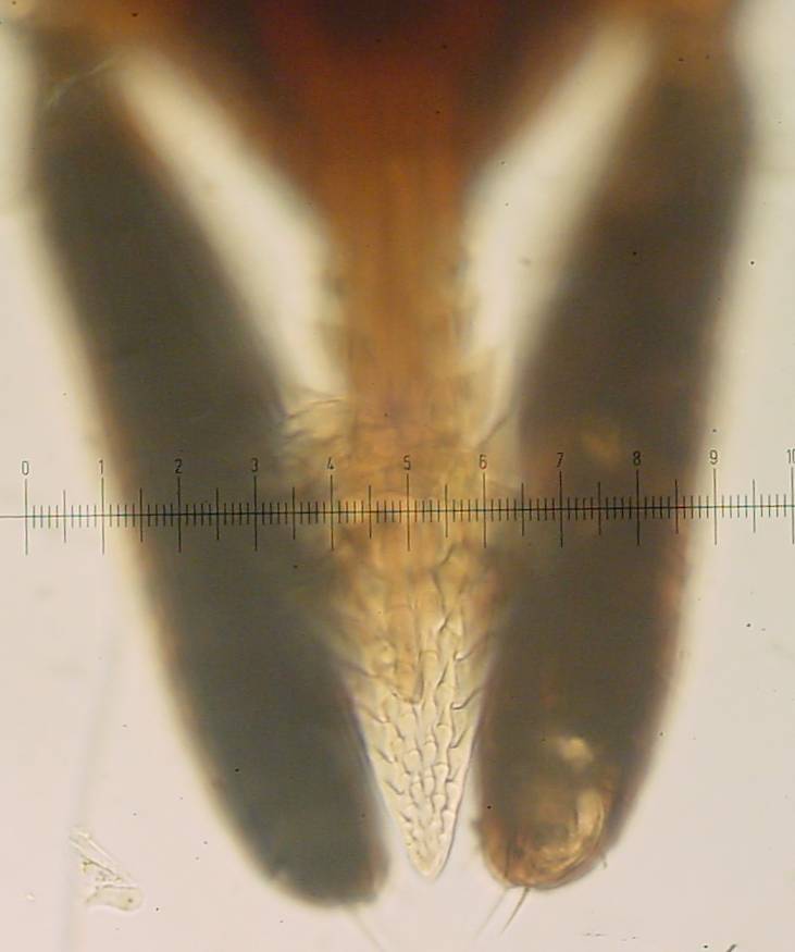 An interesting picture with a number of details. The round ornate structure aft of the rear leg is the spiracle, used for breathing. The holes visible on the spiracle connect to air tubes; these air tubes and their surrounding blood vessels are visible as a dark mass adjacent to the spiracle. The round circle with a longitudinal line in the aft center of the tick is the anus with adjacent dark internal structures. In the center of the tick the redish brown thorax shows several short hairs plus a long blood vessel running lengthwise plus a few blurry branches from the main vessel. If this were an adult tick there would be a genital pore visible as a lateral line between the rear set of legs. This nymph measured 1.4mm overall, 1mm from the base of the neck to the rear of the body - the scale shown is 100u = 0.1mm per numbered division = approximately 0.004 inch, so the legs are about the thickness of a human hair.