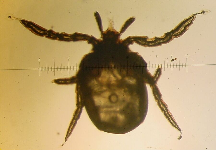 Female deer tick partially engorged, live. Ruler is 1mm per division so it is about 6mm