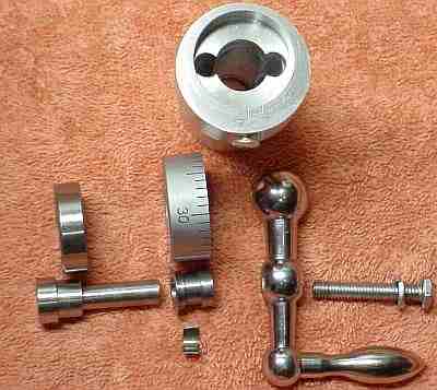 The spacer was the only difficult part to machine (see the retrospective below for thoughts on making it easier). In order to retain the bearing's outer race I needed additional material below the bearing. Using some available 1.5 inch aluminum round I placed the shaft off center so that the rim of the dial would be even with the top of the material. This meant that to align the round I had to adjust the 4 jaw to center the dot marking the desired hole then run the dti along the length of the round to determine whether it was tilted, rotate it 90 degrees, check again for tilt, adjust any tilt out, then re-adjust to center the dot (which moves when adjusting for tilt), etc. this went fine for the large hole for the shaft. Then, I turned the outside concentric with the shaft to match the diameter of the dial except the area on the end which holds the bearing and is the stop for the slide. I went through the centering process for the two holes to hold the retaining screws, the whole deal of centering the dot, adjusting the tilt to zero, etc. There must be a better way of setting this up but as a neophyte this was the best I could figure. Since any small mis-alignment of the holes would be a problem if it occurred on the end which contacts the carriage, I drilled from that end to ensure the holes would match. This meant that I couldn't counterbore to let the heads of the retaining screws in at the same time that I drilled the original holes. I figured that I'd just counterbore with the drill press since it needn't be quite as precise as the hole placement. However, the holes were so close to the center hole that they broke through causing the drill to move toward the center hole more than an acceptable amount. This was the point where I thought it was scrap but I rescued it using the Dremel for some frantic rasping to get the counterbore to match the hole. Not pretty but it worked out. A fly cutter was used to flatten the top of the spacer. After all this, I still don't know how to actually make this part efficiently using the tools I have although I would drill and counterbore the retention bolt holes prior to the center hole if starting over. Life is tough for non-machinists using a lathe!