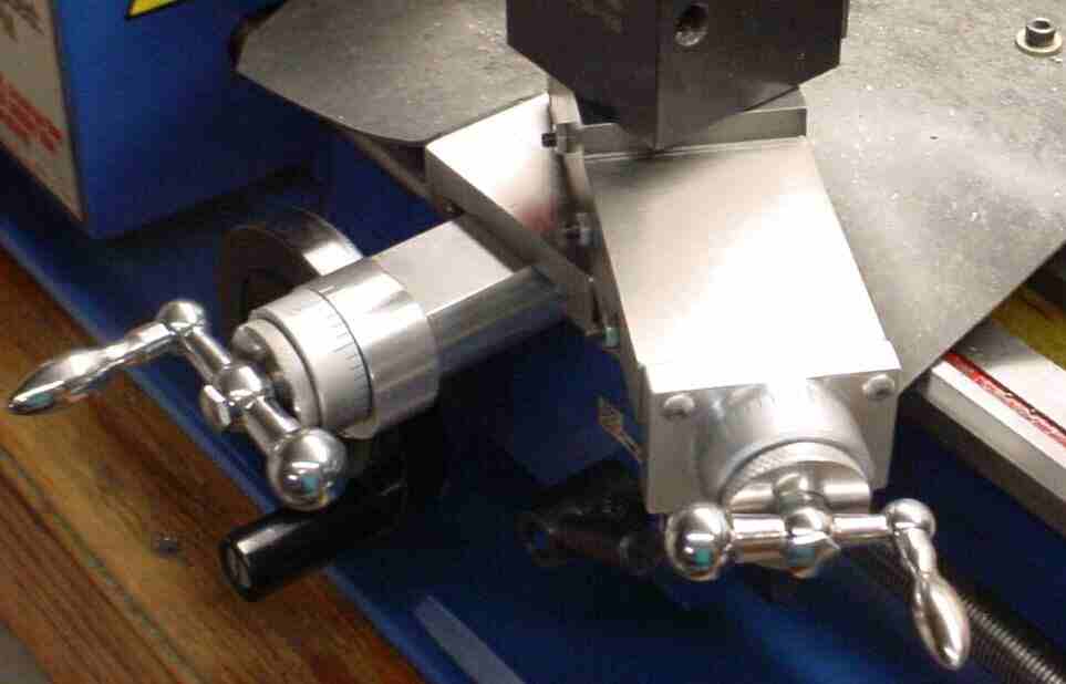 This picture shows both dial locks. The clamp on the cross feed was extended to accommodate the lock, leaving less of the shaft within the handle -- if planned for, the shaft extension and bolt could be made longer. On the compound, the thick washer between the dial and the handle is replaced by the dial lock. The dial lock is smaller diameter (1.13) than the dial to avoid conflicting with the ball on the end of the handle.