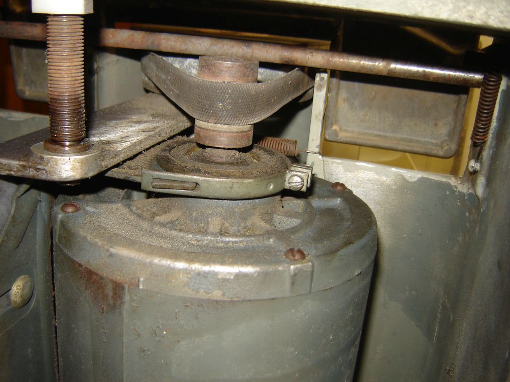 The nut on the front power unit support had been backed off and not returned to what I assume is the correct position. This nut rusted onto the threads from liquid used on the wheel so I had to turn it down until the threads would peel off, then run a die over the 1/2-20 threads. I made two nylon nuts for the front and rear supports. Although there wasn't a nut on the rear support I felt there should be one because the wobble turned the support on its threads rather than pivoting on the bronze bearings. I used these nylon nuts to lock the supports to the case with the idea that the nylon wouldn't rust in place as the original nut did. Although grease is normally not used on grinders, I added a dab to the bearings supporting the power unit. The front support sets the clearance between the wheel and the table so thread it through until the wheel clears the table when the table is in its forward position. The rear support is spring loaded to accommodate this.