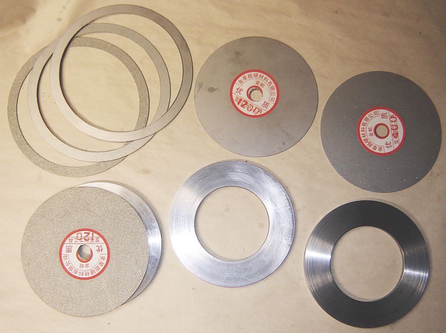 This is my Grind-R-Lap wheel collection with the new wheels in the top row. The wheels I've been using are in the bottom row, at left is a Cold Grind CBN wheel of about 400 grit, center is a diamond wheel of 600 grit, and at right is a worn out wheel converted to a lap by gluing fine carbide paper to it.