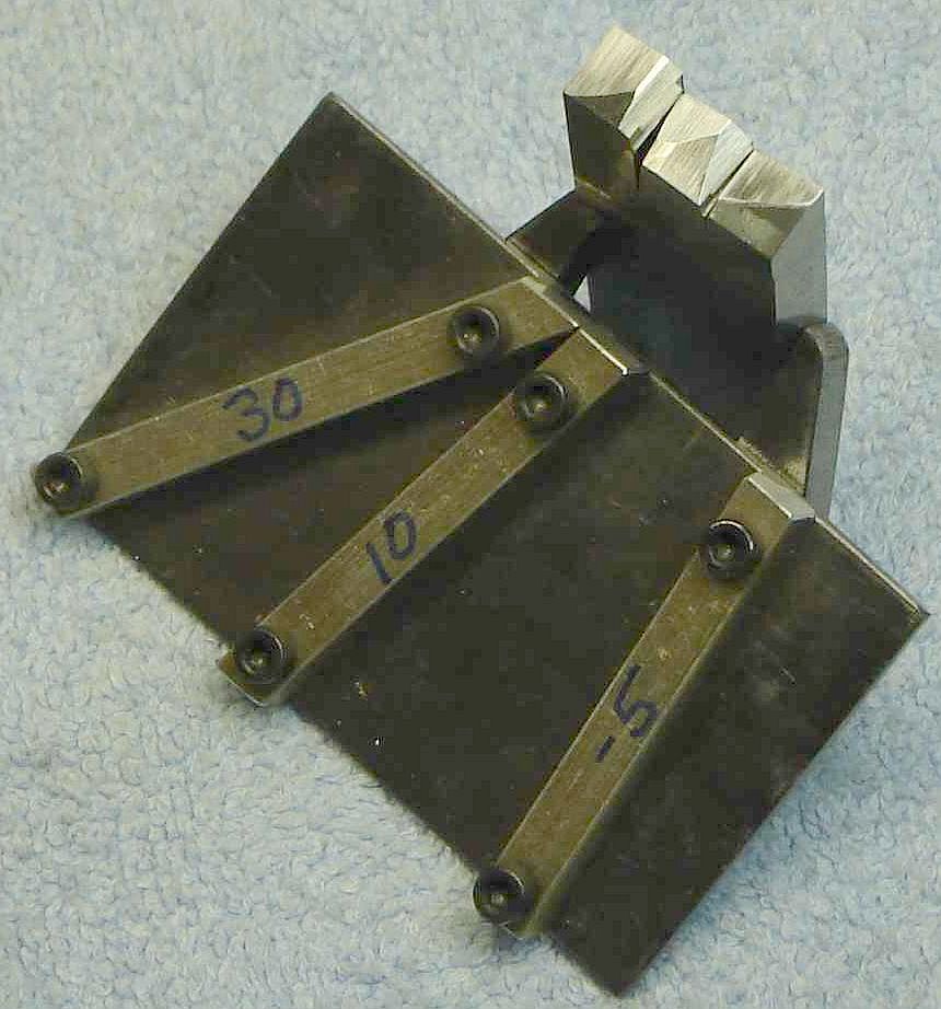 The grinding jig is trivial to build: mine is a rectangular 2"x3" piece of 1/16" steel with three 1/4" square pieces of aluminum screwed to it, as seen in the picture above. The aluminum pieces are set at the angles written on them in the picture: 30, 10, and -5 degrees. The screws are cut off and sanded flush on the bottom. This jig isn't from the book -- it's my simplistic interpretation to implement the book's suggestions easily. (A larger jig to accommodate the tool holder would allow re-sharpening without removing the tool from the holder - hindsight is always 20/20.) Bits produced with this jig all look similar (i.e. a roughing bit looks a lot like a finishing bit) so it may be helpful to mark the bits (or their tool holder) to indicate their intended use.