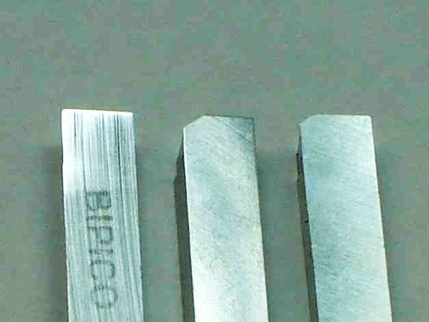 An alternative chip breaker is to simply grind the top front of the bit to leave a narrow (10x to 15x chip thickness) horizontal shelf along the front of the tool with a rise of about 1/16" behind the cutting edge. The chip, which normally flows perpendicularly from the cutting edge, runs into this rise which either bends it enough to break it or causes it to coil onto itself and break. Adjust side rake of the shelf if necessary. The picture at right shows a chip breaker, where the finishing point shows a little wear.
