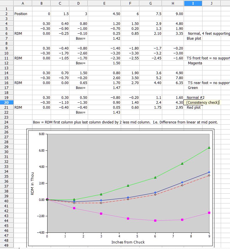 Measurements were made with all 4 feet supported, then with a 1/8" steel pad under the rear tailstock foot, then with this pad under the front tailstock foot, then measured with all 4 feet supported again as a consistency check. The data was entered into a spreadsheet which did the simplified RDM calculation and charted the results (at right, click to enlarge).