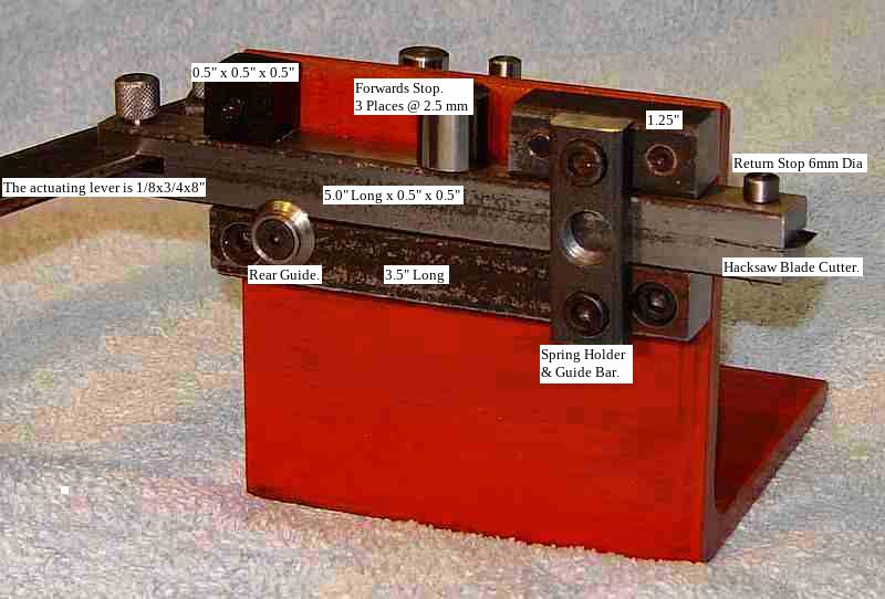 The ram is a 5" long piece of 1/2" square HRS bar, with a 1/8" slit on one end and a 0.027" slit (to fit a section of hacksaw blade)on the other end, each 1/2" deep. A 1.25" long guide of 1/2" HRS above the ram on the cutter end is held by two bolts where the bar is tapped for the bolts; the holes through the frame are slotted slightly to allow adjusting the fit so ram contact is maintained to prevent wobble while cutting. Similarly, a 1/2" cube is mounted on the lever end. A shoulder washer is screwed on (6-32) near the lever end of the lower bar to allow the ram to move horizontally a bit, as needed during cutting.